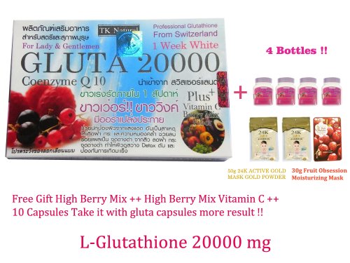 20000mg.GLUTATHIONE BERRY MIX FIBER+VIT C EVOLUTION SUPER WHITENING SKIN Professional Glutathione from Switzerland Gluta Super Evolution white 20000 mg. Vit C and Pine Bark extract white power and white as possible within a week, whitening skin than any glutathione in the market. New formula contains L-Glutathione concentration of 20000 mg. from Switzerland blend with natural extract and pure vitamin of berry mixed fiber cold extracted process. It will not lose valuable vitamins and nutrients to the skin. It is enrich with Vitamin C that help brighten skin cell and against free radicals in the body that makes the skin dull and wrinkles. Help to reduce dark spot from acne , blemishes, freckles, melasma.
