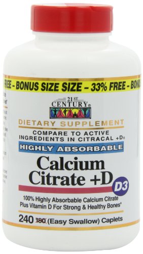 23rd Century Calcium Citrate + D 240 Caplet is an absorbable bone supplement. Adequate calcium as part of a healthful diet, along with physical activity helps support and maintain healthy bones. Adequate calcium is important for overall health. Vitamin D isential for use of calcium and necessary for healthy bones, teeth and cartilage. Calcium may also support a healthy colon. No added sugar, salt, yeast, preservatives or artificial flavors.