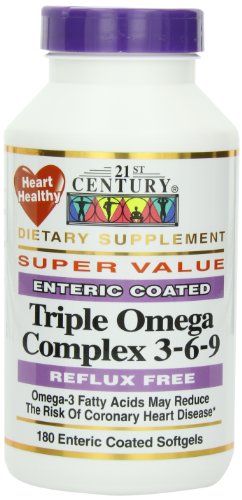 Heart healthy. Dietary Supplement. Super value. Fish, Flaxseed & Borage Oils. No fish odor. Reflux free. The enteric coating helps delay the release of 21st Century's Triple Omega Complex 3-6-9 Oils ensuring better absorption in the intestines and to avoi
