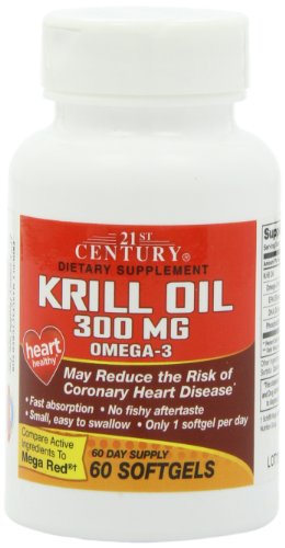 Supportive byt not conclusive research shows that consumption of EPA and DHA omega-3 fatty acids may reduce the risk of coronary heart disease. 21st Century krill oil provides omega-3 fatty acids which are considered good fats important for cellular, heart and metabolic health. Omega-3 fatty acids also help support eye health, joint health and brain function. Gluten free. No sugar, preservatives or artificial flavors. 21st Century vitamins and supplements are manufactured in a CGMP facility under the strictest standards for product quality, including potency and purity. 21st Century prides itself on providing you with a great product at the best value. This statement has not been evaluated by the food and drug administration. This product is not intended to diagnose, treat, cure or prevent any disease. Schiff mega red is a registered trademark of schiff nutrition group.