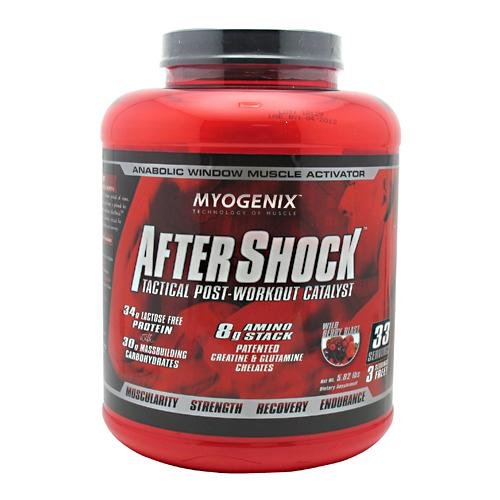 Each serving of AfterShock contains:34 g Whey Protein (100% Lactose Free, Fast Digesting Proteins With Di & Tri Peptides)30 g Mass Building Carbohydrates (Rapid Absorption, Glycogen Replenishing Carbohydrates) 8 g Amino Formula - Creatine & Glutamine (High Absorption, Patented Magnesium Creatine Chelate And Magnesium Glycyl Glutamine)7.25 g Branched Chain Amino Acids (Leucine, Isoleucine & Valine)1500 mg Joint Repair Formula (Glucosamine, Chondroitin & MSM)1500 mg Antioxidant Blend (Alpha Lipoic Acid, Vitamin C and B-Vitamins)