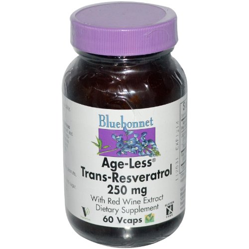 Age Less Trans Resveratrol 250mg by Bluebonnet 60 VegCap Age-Less Trans-Resveratrol 250 mg Vcaps Bluebonnets Age-Less Trans-Resveratrol 250 mg Vcaps provide the active trans isomer from 4 1 red wine extract and Japanese knotweed (a more concentrated source of trans-resveratrol) that has undergone an enzymatic purification process rendering it virtually free of impure compounds commonly found in lower quality resveratrol products. Available in easy-to-swallow vegetable capsules for maximum assimilation and absorption. Age-Less is a trademarks of Bluebonnet Nutrition Corporation. Other ingredients 100 Kosher vegetable capsules vegetable cellulose vegetable magnesium stearate. Free of milk egg fish crustacean shellfish tree nuts peanuts wheat and soybeans. Also free of corn yeast gluten barley rice sodium and sugar.