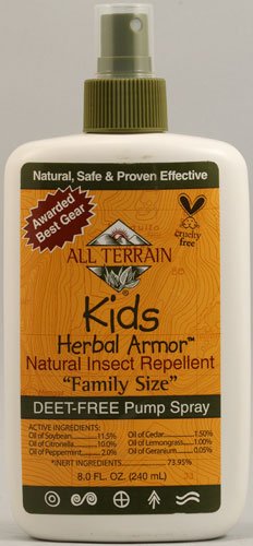 All Terrain Kids' Herbal Armor is a highly-effective, safe, natural, DEET-Free insect repellent that uses six natural-repelling oils at 25% total concentration. A patented time-released encapsulation to be 100% effective for two hours and 95.8% for three hours. Herbal Armor is non-irritating, allergy tested, and safe for sensitive skin. Made for active outdoor enthusiasts, Herbal Armor is sweat and water-resistant for active lifestyles. Won't damage clothing or equipment. Meets strict standards