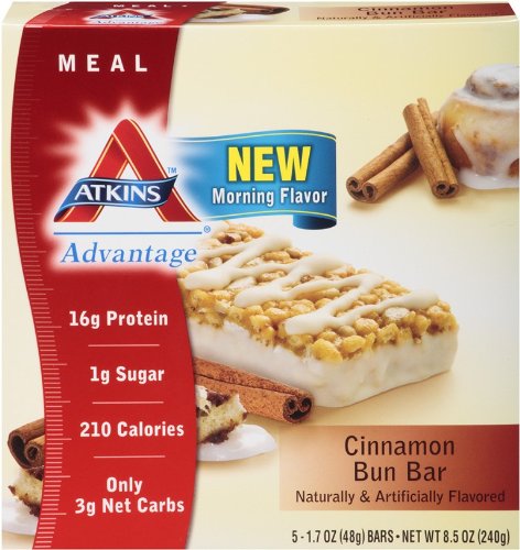 Atkins advantage cinnamon bun meal bars - 1g sugar, 210 calories, only 3g net carbs, 16g protein, 5g fiber - this product can be used in all phases of the atkins diet atkins is a powerful life-time approach to successful weight loss and weight management. Whether you're trying to lose weight of maintain your optimal weight, atkins bars and shakes are a delicious and nutritious way to help you reach your goals. Counting carbs? The net carb count helps you count carbs that impact blood sugar. Fiber, sugar alcohols, including glycerin, should be subtracted from the total carb since they minimally impact blood sugar. Find out more about the atkins diet, and atkins shakes by visiting atkins.