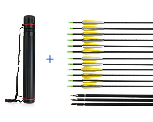 Buffalo Arrow Precision 31" Adult Carbon Hunting / Target Practice Arrows 2 Yellow 1 White Vanes with Field Points (12 Pack)+One Adjust Length Arrow Tube Archery Quiver