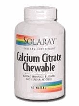 Calcium Citrate Chewable 1000mg (250mg each) by Solaray 60 Chewable Solarays Calcium Citrate Chewable is one of the most convenient forms of supplementing your diet with the essential mineral calcium which provides nutritive support for healthy bones and teeth. This product is specially formulated by bonding calcium with natural citric acid with the intent to improve absorption. Our great tasting chewables have been formulated with a mixture of natural sweeteners and flavors for a fresh orange taste. Size 60ct 250mg Directions As a dietary supplement chew 4 wafers daily. Serving Size 4 Tablet 15 Servings per container Ingredients Amount per serving Daily Value + Total Carbohydrates 7 g 2 Total Calories 30 Vitamin C (from Orange Juice Powder) 2 mg 3 Calcium (as Calcium Citrate) 1000 mg 100 Key to Ingredients Daily Value not established. + Percent Daily Value is based on a 2 000 calorie diet. Values differ depending on age Values differ depending on age Other Ingredients Sorbitol orange