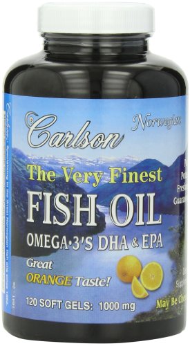 Very Finest Fish Oil Orange by Carlson Laboratories 120 Softgel Very Finest Fish Oil Softgels Medical Scientists internationally are encouraging people to eat more fish. Fish body oil is the ONLY MAJOR SOURCE of the polyunsaturated Omega-3 s EPA and DHA. For those individuals who do not eat an oily fish diet Carlson offers Omega-3 s in easy-to-swallow soft gelatin capsules. Carlson softgels contain 1000 mg (1 gram) of a special concentrate of fish body oils from deep cold ocean-water fish which are especially rich in the important Omega-3 s EPA and DHA. THIS PRODUCT is regularly tested (using AOAC international protocols) for freshness potency and purity by an independent FDA-registered laboratory and has been determined to be fresh fully potent and free of detrimental levels of mercury cadmium lead PCB s and 28 other contaminants. Delicious natural orange flavor.