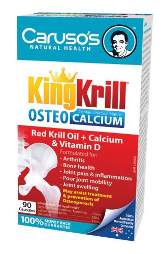 Caruso’s King Krill Oil Osteo capsules are a 2 in 1 solution for people suffering from arthritis and osteoporosis. Caruso’s King Krill Osteo combines the benefits of Omega 3 essential fatty acids from krill oil with the added benefits of Aquamin Forte and Vitamin D. What is Aquamin? Aquamin is a unique marine multi mineral complex containing a sustainable and bio-active source of calcium and magnesium. This combination, which is only available in Caruso’s King Krill Osteo, will assist with improving and maintaining bone health in people with or who are at risk of developing osteoporosis and may help reduce the pain and inflammation associated with Arthritis and Osteoarthritis. What is Vitamin D? Vitamin D helps assist the normal formation and maitenance of healthy bones through regulating and increasing the absorbtion of calcium. What is Krill Oil? Krill Oil is a source of omega 3 Essential fatty acids, which is essential for humans to consume as they cannot be manufactured by the body. People who experience joint pain, stiffness and immobility from conditions such as Arthritis can benefit from Krill oil supplementation as the Omega 3 essential fatty acids found in red krill oil can improve pain and reduce inflammation assosciated with Arthritis.