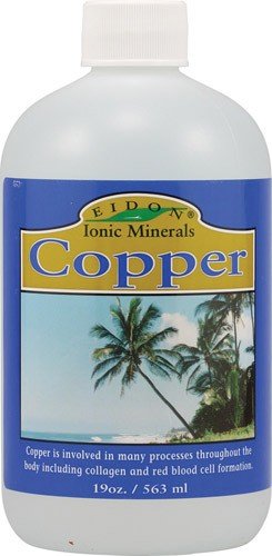 Eidon Ionic Minerals Copper Liquid - 18 oz (533 ml) Eidon Ionic Minerals Copper Liquid works with Vitamin C to form elastin, aiding in the formation of strong veins and arteries as well as all connective tissue. Copper is involved in red blood cell production and is necessary for absorption and utilization of iron. It is required for many physiological functions including a healthy thyroid. Eidon Ionic Minerals Liquid Copper is easy to swallow and gentle on the stomach. It contains no sugars, starch, gluten, preservatives, artificial colors or flavors. Eidon Liquid Copper has never been tested on animals, contains no animal by-products and is suited for vegan diets. Purity you can see, taste and feel. Taking the guesswork out of supplements: Eidon uses a proprietary process that transforms pure mineral crystals into a fully hydrated, 100% bioavailable liquid ionic supplement. easy to swallow gentle on the stomach made in the USA and quality tested to assure safety and potency. The Eidon Difference: Large doses are used in solid supplements because most of the mineral is not absorbed. Eidon minerals are 100% bioavailable. It is not necessary to take large doses in order to be effective. It's not what you take, it's what you absorb. Liquid CopperCopper is essential for both iron and zinc utilization, as well as for maintaining a healthy cardiovascular system. Copper, along with iron, is necessary to produce hemoglobin (the part of the red blood cell that carries oxygen from the lungs to all the cells in the body). Copper is necessary for normal development and maintenance of blood, bone, nerves, connective and other tissues. A deficiency of this essential trace mineral can cause a variety of disorders. Copper parallels iron. Iron is the essential element in hemoglobin. But, without copper, iron is not transported correctly throughout the body.