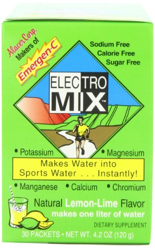 Alacer Corp. - Makers of Emergen-C® - Makes Water into Sports Water...Instantly! Sodium Free - Calorie Free - Sugar Free - Makes one liter of water - Every living person needs electrolytes, especially Potassium* - Potassium is an essential element needed by cells to maintain water balance and optimal nerve function. Each cell requires sodium and potassium, but in differing amounts. Inside the cell, the concentration of potassium is far higher than sodium. Modern diets typically contain excessive sodium at the expense of adequate potassium. ElectroMIXTM helps provide essential potassium that is often lacking in modern diets.* Whether your water is bottled, filtered or tap, when you add ElectroMIX® to it you'll get more benefits than the average sports drink. And you'll be drinking water, which is the beverage your body wants, craves and needs the most.* ElectroMIXTM is a water mineralizer and dietary supplement that contains nutritionally balanced essential electrolytes: Potassium, Magnesium, Calcium, Manganese, plus Chromium* Dissolve the contents of one packet in a liter of water, and soon your water will become a refreshing and nutritious sports drink. ElectroMIXTM tastes great, has a hint of lemon-lime, and comes with 30 packets per box. ElectroMIXTM is an ideal addition to virtually any beverage, providing the electrolytes your body needs.* *These statements have not been evaluated by the Food and Drug Administration. This product is not intended to diagnose, treat, cure or prevent any disease.