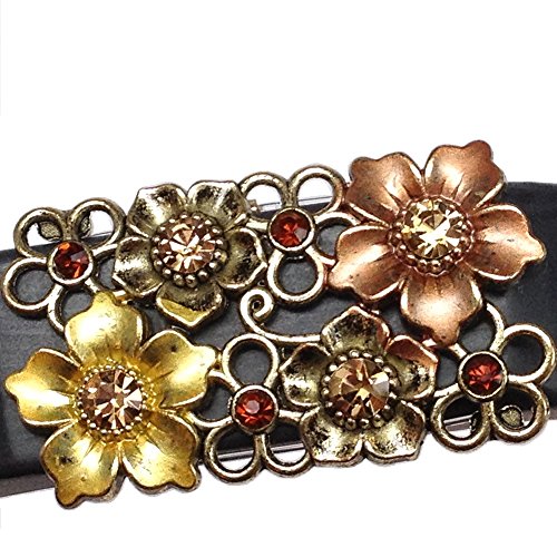 Fits Fitbit Force plus other bands 45-55mm in circumference. Brass-, gold-, and copper-finish metal flowers with gold and whiskey colored rhinestones. Various finished metal, rhinestones. Clear elastic cording. 47x27mm. Fitness tracker and band not included.