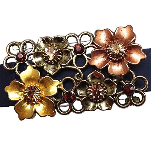 Fits Fitbit Flex, Jawbone UP and UP24 plus other bands 35-45mm in circumference. Brass-, gold-, and copper-finished flowers with gold and whiskey colored rhinestones. Various finished metal, rhinestones. Clear elastic cording. 47x27mm. Fitness tracker and band not included.