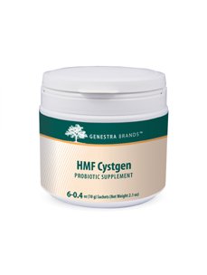 HMF Cystgen 6 (0.4 oz) sachets Probiotic Supplement Supplement Facts Serving Size: 1 Sachet (10 g) Servings per Container: 6 Amount per Serving Calories 15 Sodium 10 mg Total Carbohydrate 4 g Dietary Fiber 1 g Sugars 1 g Vitamin C (ascorbic acid) 600 mg Potassium (potassium citrate/ bicarbonate) 1515 mg Probiotic Consortium 10 billion CFU Lactobacillus acidophilus (CUL-60) Lactobacillus acidophilus (CUL-21) Cranberry (Vaccinium macrocarpon) 3300 mg - Fruit Juice Concentrate Other ingredients: Microcrystalline cellulose, citric acid Human MicroFlora (HMF) probiotics are proprietary, non-pathogenic, human-sourced microflora bacterial strains that exhibit strong epithelial adherence and a naturally high tolerance to stomach acid. Recommended Adult Dose: In a glass, add eight ounces (250 ml) of water to one sachet (10 g) of HMF Cystgen and mix. Take once daily with a meal, or as recommended by your healthcare practitioner. Risk Information: If you are experiencing nausea, fever, vomiting, bloody diarrhea or severe abdominal pain; or if you have an immune-compromised condition, do not use. If you are taking blood thinners; or if you have a history of kidney stones, consult your healthcare practitioner prior to use. If symptoms of digestive upset occur, worsen or persist beyond three days, discontinue use and consult your healthcare practitioner. Guaranteed to contain no added wheat, gluten, soy, sodium, artificial coloring or flavoring or antimicrobial preservatives. Ideal for vegetarians. Quality Assurance: Safety-sealed for your protection and for product freshness. Do not use if outer seal is missing or broken. Store under refrigeration (below 46° F).