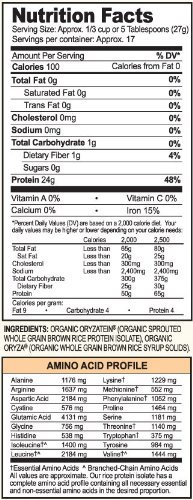 Raw Gluten Free Allergen Free 100% Natural Non-GMO Clean Label 100% Essential Amino Acids Dairy Soy and Gluten Free Deliciously Smoother Sustained Release 100% Plant Based Whole Grain Brown Rice Isolate Powder Vegan USDA Organic Kosher Per Serving 24 g Protein 96% whey AA correlation* 5.0 g BCAA 4.6 g glutamine and precursors 0 g sugar Low glycemic index *Our rice protein has an amino acid profile that is 96% correlated to that of whey protein isolate. Finally Protein for All People Growing Naturals has harvested the secret of allergen-free whole grain brown rice unleashing all its amazing possibilities lifelong nutrition easy applications and great flavor. The Rice Protein Revolution Growing Naturals' rice protein supplies all the essential amino acids which help build muscle and reduce fat making it a vital part of your plan. It's the only rice protein to utilize a 90% protein (isolate) thanks to a proprietary chemical-free raw process that extracts the naturally occurring plant protein. The result is superior bioavailability and digestibility supplying better sustained energy than whey (and without the cholesterol). Try it for yourself and you'll find Growing Naturals' smoother texture and great flavor will satiate you day or night. Ingredients : Organic oryzatein (organic sprouted whole grain brown rice protein isolate) organic oryza (organic whole grain brown rice syrup solids).Organic : YesGluten Free : YesDairy Free : YesYeast Free : YesWheat Free : YesVegan : YesKosher : YesSize : 16.2 OZPack of : 1Product Selling Unit : Each