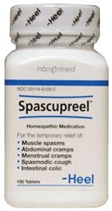 Spascupreel 100 tabs For the temporary relief of muscle spasms anywhere in the body including abdominal cramps, menstrual cramps, spasmodic cough, intestinal colic, and smooth musculature spasms. Tablets: Each 300 mg tablet contains: Aconitum napellus 6X (abdominal colic, sensitive to pressure; in?ammation; numbness) 60 mg; Ammonium bromatum 4X (spasmodic cough), Colocynthis 4X (cramp-like hip pain; muscular contraction; sharp pain in abdomen), Atropinum sulphuricum 6X (spasm of smooth musculature; pertussis), Gelsemium sempervirens 6X (cramp in muscles of forearm; trembling and weakness of all limbs), Magnesia phosphorica 6X (muscular cramps with radiating pain; hand and arm weakness; ?ngertips numb), Veratrum album 6X, (cramps in calves; sore, tender joints) 30 mg each; Passi?ora incarnata 2X (anti-spasmodic; restlessness), Chamomilla 3X (?atulent colic; dry, tickling cough), Agaricus muscarius 4X (spasmodic cough; hiccough), Cuprum sulphuricum 6X (cramp of smooth and striped musculature; pertussis; bronchial asthma) 15 mg each in a lactose base. Tablets: Adults and children above 6 years: 1 tablet sublingually or dissolved completely in mouth 3 times daily or as directed by a physician. Infants and children to 6 years: 1/2 the adult dosage.