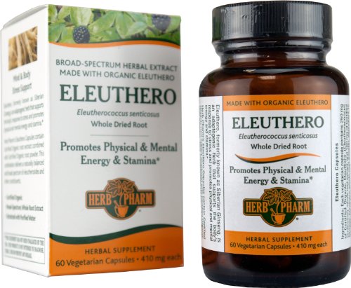Herb Pharm-eleuthero 410 mg. 60 vegetarian capsules Herb Pharm eleuthero, formerly known as Siberian ginseng, is an adaptogenic herb that supports the body's response to stress and promotes physical and mental energy and stamina.