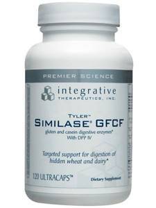 Digestive discomfort impacts people's lives in an immediate way. The digestion of hidden gluten and casein, in particular, can be particularly difficult for some people '" often times leading to occasional indigestion, gas, bloating, and constipation.*, Similase GFCF features DPP IV (dipeptidyl peptidase) activity, from a protease enzyme specific to digestion of gluten and casein.* Featuring 200% more protein-digesting capability per serving than competitive products, Similase GFCF delivers superior DPP IV activity.*, Unlike some existing gluten-digestion products on the market, Similase GFCF not only helps digest gluten and casein, but fats, proteins, and carbohydrates '" making it the most comprehensive formula available for complete digestion.*, Tyler Similase GFCG 120 vcaps, Dietary Supplement, ' Gluten and casein digestive enzymes with DPP IV, ' Vegetarian, Supplement Facts, Serving Size: 2 Capsules, Servings per Container: 60, Amount per Serving, Total Carbohydrate <1 g, Pure Plant Enzymes, 543 mg Assay Method, D PP IV Protease Blend FCC (pH 4.7) 134, 600 HUT, (Protease I, II, III, IV, V) FCC (pH 7.0) 22, 660 PC, USP (pH 7.5) 12, 556 USP, Amylase FCC (pH 4.8) 9, 530 DU, USP (pH 6.8) 12, 800 USP, Lipase I, II FCC (pH 6.5) 408 LU, FIP (pH 7.0) 882 FIP, Phytase Phytic Acid (pH 6.0) 0.67 PU, Lactase I, II FCC (pH 4.5) 642 ALU, Cellulase I, II FCC (pH 4.5) 141 CU, Sucrase (Invertase) FCC (pH 4.6) 119 INVU, Other Ingredients: cellulose, vegetable capsule (modified cellulose), inulin (from chicory root), and silicon dioxide. Recommendations: Take 2 capsules with each meal or as recommended by your healthcare practitioner. Caution: While Similase GFCF will reduce the level of reactive gliadin and gluten proteins in a meal, it is advised that celiac disease sufferers continue with their normal gluten exclusion diet as even small amounts of gliadin can cause adverse reactions in the most sensitized individuals.