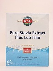 Pure Stevia Plus Luo Han by Kal 100 Packet Size 1g Powder 100 count Directions As a dietary supplement use 1 packet as desired with a beverage or meals. Serving Size 1 Powder Ingredients Amount per serving Daily Value + Total Carbohydrate 1g 1 Stevia Extract (Stevia rebaudiana) (leaf) (Supplying min. 80 Steviosides) 186 mg Luo Han (Siraitia grosvenorii) (friut extract) 25 mg Key to Ingredients Daily Value not established. + Percent Daily Value is based on a 2 000 calorie diet. Values differ depending on age Values differ depending on age Other Ingredients Maltodextrin and Calcium Silicate