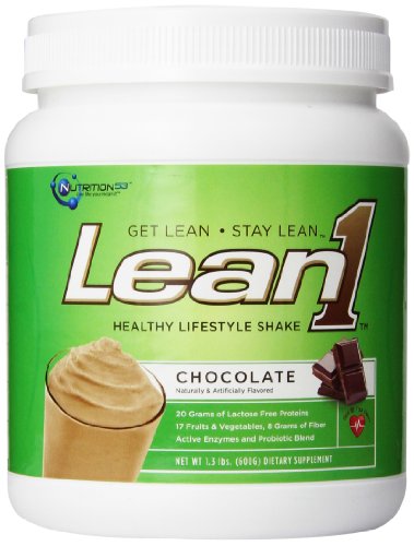 Nutrition 53 Lean 1 Performance Shake Chocolate - 1.3 lbs. (600g) Nutrition 53 Lean1 Performance Shake Chocolate is good for your heart. Get lean and stay lean with Nutrition 53 Lean1 Performance Shake. You'll notice the difference right away with Nutrition 53 Lean1 Performance Shake. The energy. The incredibly good tase. The satisfaction in knowing that you're giving your body the very best nourishment there is. Nutrition 53 Lean1 Performance Shake - feel the difference. Nutrition 53 Lean1 Performance Shake is the next generation of premium, on-the-go nutrition. Nutrition 53 Lean1 Performance Shake makes complete nutrition easy, delicious and right for you! Foods containing at least 0.65 grams per serving of plant sterol esters, consumed twice daily for a total intake of at least 1.3 grams as part of a diet low in saturated fat and cholesterol, may reduce the risk of heart disease. 20 Grams of Lactose Free Proteins 17Fruits & Vegetables, 8 Grams of Fiber Active Enzymes and Probiotic Blend Rapid, Effective, Healthy Weight Loss Toning and Defining Lean Muscles Fueling Your Active Lifestyle Healthy, Energized Snack Nutrition 53 Lean1 Is Your Answer... ..to lose weight quickly without ever feeling hungry! Lean1 combines the powerful nutrients you need to lose body fat and tone muscles in the convenience of a healthy meal replacement shake. It delivers high-octane fuel that boosts energy levels at all times of the day with 20-30 grams of premium protein, 14 organic fruits and vegetables, 5 grams of fiber and heart healthy phystosterols in every serving. Try getting all that nutrition in one day, never mind one meal! Nutrition 53 Lean1 Weight Loss Protein Shakes Lean1 is an extremely healthy and highly effective weight loss protein powder with a proven track record to help you lose weight fast without ever feeling hungry.