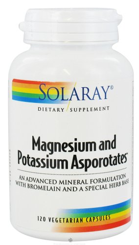 Magnesium and Potassium Asporotate by Solaray 120 Capsule Magnesium and Potassium Asporotates with Bromelain dietary supplement. A highly advanced mineral supplement in a special herb base. This highly advanced formula consists of magnesium and potassium which have been combined with aspartic acid citric acid and a special delactosed whey protein concentrate containing naturally occurring orotic acid. Each capsule contains magnesium and potassium which have interacted with the other natural compound producing a natural chelation process resulting in the formation of a special complex containing Magnesium- Potassium Asparate Magnesium- Potassium Citrate and Magnesium-Potassium Orotate. Contains none of the yeast or soy commonly found in full range amino acid chelates. Size 120ct Directions As a dietary supplement take 1 capsule in the morning and 1 capsule in the evening with meals or with a glass of water. Serving Size 2 Capsule 60 Servings per container Ingredients Amount per serving