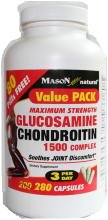 Feel the difference with Mason's Maximum Strength Glucosamine/Chondroitin. Mason's unique formula has everything you need for joint/arthritis relief in 1 capsule. If past injuries, morning stiffness or after exercise joint pain afflict you, start supplementing now with Maximum Strength Glucosamine/Chondroitin. This formula is recommended by thousands of osteoarthritis doctors and it is the most clinically studied formulation for optimum joint mobility and comfort. Only 3 pills daily! Quantity: 280 Capsules