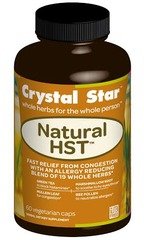 Natural-HST by Crystal Star 60 Capsule Anti-HST Capsules Fast acting... Natural antihistamines ease congestion and reduce inflammation. Relief begins in 10 minutes or less Helps clear mucus. Reinforces your bodys defenses against allergens. DIRECTIONS Take 1 to 2 caps daily as needed. Warning Do not exceed recommended dosage. Do not use product for more than 7 to 10 days. Seek advice from health care professional prior to use if you are pregnant or nursing or if you have high blood pressure heart or thyroid disease diabetes or prostate problems or if taking any prescription drugs. Not for use by children under 18 years. INGREDIENTS Marshmallow Rt. (Althea o.) Echinacea Angustifolia Rt. Green Tea Lf. (Camellia s.) Goldenseal Rt. (Hydrastis c.) White Tea Lf. (Camellia s.) White Pine Bark (Pinus s.) Bee Pollen Sea Buckthorn Bry. (Hippophae r.) Acerola Cherry (Malpighia g.) Burdock Rt. (Arctium l.) Licorice Rt. (Glycyrrhiza g.) Juniper Berry (Juniperus c.) Thyme Lf. (Thymus v.) Parsley Rt