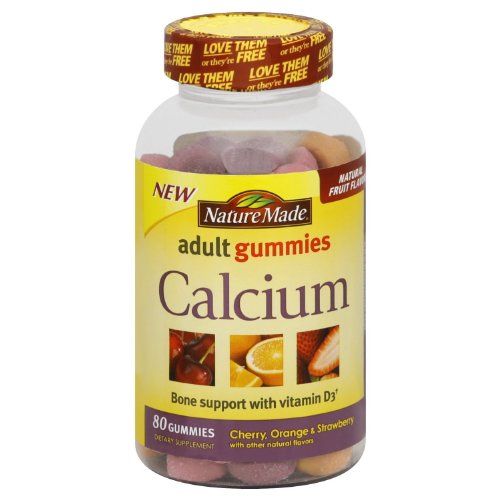 Nature Made Calcium Adult Gummies are delicious gummy vitamins with calcium and vitamin D3 to help support and maintain strong bones and teeth.† Each serving provides 500 mg of calcium and 700 IU of vitamin D3. They offer a great-tasting way to receive the health benefits of these essential nutrients. Helps Build Strong Bones and Teeth † Nature Made Calcium Gummies help support and maintain strong bones and teeth.† Each serving provides 500 mg of calcium and 700 IU of vitamin D3, which enhances calcium absorption.† Safe and Quality Ingredients All Nature Made products are made in accordance with strict Good Manufacturing Practice standards. Their nutrition supplements are made from carefully selected ingredients from trusted suppliers. Nature Made products are guaranteed to meet high quality standards of purity and potency. When you take the vitamins behind that familiar yellow label, know that you're taking the best for your health. This supplement contains natural fruit flavors and no artificial preservatives, yeast or gluten. Colors derived from natural sources - no synthetic dyes. † These statements have not been evaluated by the Food and Drug Administration. This product is not intended to diagnose, treat, cure or prevent any diseases. Nature Made Calcium Adult Gummies At-a-Glance Supports and maintains strong bones and teeth † Adequate calcium and vitamin D, as part of a well-balanced diet, may reduce the risk of osteoporosis Delicious natural fruit flavors 80 gummies Usage Suggested Use: Chew 2 gummies daily. Nature Made adult gummies are perfect for adults who want a tastier, more pleasant way to take vitamins and supplements. Our calcium adult gummies come in delicious, all natural cherry, orange and strawberry flavors and are a great tasting way to take your vitamins every day. Adequate calcium and vitamin D throughout life, as part of a well balanced diet, may reduce the risk of osteoporosis.