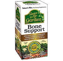 Source Of Life Garden Bone Support by Nature's Plus 120 VegCap Source of Life Garden Bone Support VCaps w AlgaeCal Organic Gold Standard Whole Food Calcium Magnesium Vitamin D3 and Vitamin K2 GROWN FROM CERTIFIED ORGANIC WHOLE FOODS Source of Life Garden Bone Support Caps with Organic Gold Standard Nutrients is the breakthrough all-organic source of whole-plant-source calcium and magnesium plus vitamin D3 (cholecalciferol) and vitamin K2. Source of Life Garden Bone Support nutritionally supports healthy bones with 1000 mg of the most assimilable plant-based calcium from AlgaeCal. This marine algae is carefully and sustainably harvested live from the pristine shores of protected coastline in South America. For maximum absorption and utilization Garden Bone Support provides 1000 IU of vitamin D3. Its vitamin K2 (menaquinone-7) is the most bioavailable form of vitamin K the critical bone-health nutrient. Garden Bone Support features Certified Organic AlgaeCal calcium and magnesium 100 mc