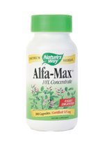 Alfalfa (Medicago Sativa) is a nutritive herb rich in minerals and vitamins especially Iron and vit K considered an estrogen precursor, also may be used for allergies, anemia, arthritis, asthma, blood disorders, fatigue, digestion, high cholesterol and diabetes etc.Nature's Way Alfa-Max is a highly concentrated (10X) extract of fresh green Alfalfa along with Alfalfa leaves (Medicago sativa) in preservative-free capsules. It is made more assimilable by removing the indigestible cellulose fiber.