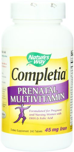 Completia Prenatal by Nature's Way 240 Tablet Ultra-Safe Prenatal Multivitamin with HEALTHY BABY Nurtrients Healthy Eye Brain- 50 mg of DHA Healthy Nerve Development- recommended potency of Vitamin B6 B12 and Folic Acid Optimal Iron Absorption- 45 mg of iron to help with the proper ratio of iron to calcium and magnesium Pleasent Scent- coated with a subtle hint of peppermint a benefit expecting moms will especially appreciate during times of morning sickness Dosage Take 2 tablets twice daily. Although the serving size is 2 tablets it is recommended to take 4 (total) tablets daily. Dosage Form Does Not Contain Preservatives artificial flavors or colors. No yeast milk lactose wheat or corn. Precautions Accidental overdose of iron-containing products is a leading cause of fatal poisoning in children under 6. Keep this product out of reach of children. In case of accidental overdose call a doctor or Poison Control Center immediately.