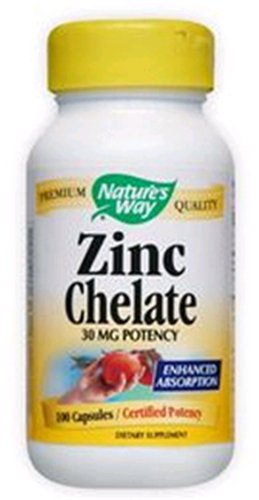 Zinc 30mg by Nature's Way 100 Capsule Zinc is essential for cellular reproduction and is present in all tissues organs and secretions of the body. Zinc is provided in an advanced amino acid chelate complex for optimal absorption. Dosage Take 1 capsule daily preferably with food. Dosage Form Does Not Contain Artificial ingredients preservatives yeast milk lactose wheat sugar soy or corn