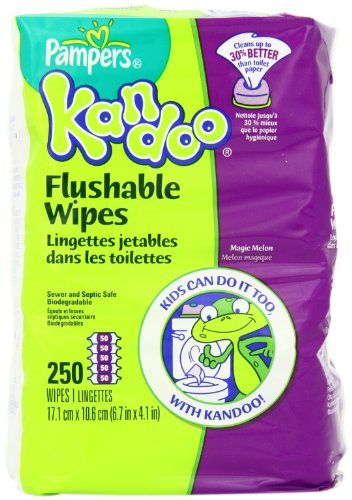 Kandoo flushable toilet wipes clean up to 30% better than toilet paper. They're moistened with lotion and pop up from the tub with the push of a button designed for little hands.