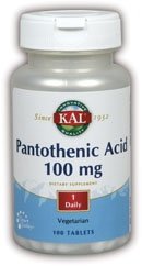 Pan Acid (Pantothenic Acid) 100mg by Kal 100 Tablet Pantothenic Acid100 mg vegetarian dietary supplement. Rapid-Solve Disintegration within 30 Min. (USPXII) Contains No Added Yeast Wheat Corn Milk Egg Soy Glutens Sugar Animal Derivatives Artificial Colors Starch or Preservatives. Size 100ct 100mg Directions As a dietary supplement take 1 tablet daily with a meal or glass of water. Serving Size 1 Tablet 100 Servings per container Ingredients Amount per serving Daily Value + Pantothenic Acid-100 (as Calcium d-Pantothenate) 100 mg 1000 Key to Ingredients Daily Value not established. + Percent Daily Value is based on a 2 000 calorie diet. Values differ depending on age Values differ depending on age Other Ingredients Cellulose stearic acid silica magnesium stearate Other See product label for more information.