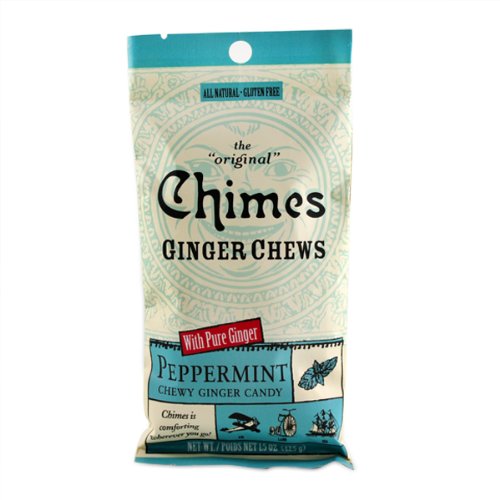 Peppermint Ginger Chews by Chimes 1.5 oz Bag Peppermint Ginger Chews For three generations Chimes has been making the pure ginger chews candy that awaken your senses and lift your spirits. Using the traditional time-honored technique of stone grinding we are able to extract the purist ginger essence that gives Chimes its invigorating warming sensation. Chimes gives your mouth that shooting musical experience. Just as yin complements yang so is spicy balanced by sweetness in Chimes. Energy and serenity. Body and Spirit. Perfect harmony. Take a break and indulge. Let Chimes energizes and refreshes you for a new day. Ingredients Cane Suger Maltose Choice Ginger Starch Vegetable Oil Menthol Peppermint Oil. Supplement Facts Serving Size 0.14 oz Amount Per Serving Daily Value Calories 16 Calories from Fat 0 Total Fat 0 g 0 Saturated Fat 0 g 0 Trans Fat 0 g 0 Sodium 0 mg 0 Total Carbohydrates 4 g 2 Sugars 3 g Protein 0 g Percent Daily Values are based on a 2 000 calorie diet Does not contain