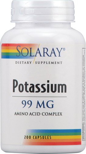 Potassium 99mg by Solaray 200 Capsule Potassium 99 mg dietary supplement Amino Acid Complex. Ideal for food-sensitive individuals. The potassium in this product is reacted with whole rice concentrate rather than ordinary soy yeast or milk proteins which are commonly used to chelate minerals. The special rice used by Solaray is approximately seven times higher in amino acid content than ordinary rice and has a better essential amino acid profile than soy. Size 200ct 99mg Directions As a dietary supplement take 1 capsule daily with a meal or a glass of water. Serving Size 1 Capsule 200 Servings per container Ingredients Amount per serving Daily Value + Potassium (as Potassium Amino Acid Complex) 99 mg 3 Key to Ingredients Daily Value not established. + Percent Daily Value is based on a 2 000 calorie diet. Values differ depending on age Values differ depending on age Other Ingredients Gelatin (capsule) rice flour magnesium stearate Parsley (leaf) Chamomile (aerial) and Watercress (aerial