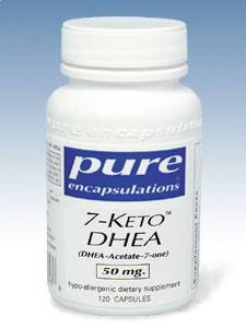 7-Keto DHEA 50 mg 120 vcapsThis item is not available for shipment to Canada or Norway. 7-KETO DHEA 100 mg. Unique DHEA metabolite *7-KETO DHEA, a safe and natural metabolite of DHEA, was the subject of research for over a decade at the University of Wisconsin in Madison. Of over 150 DHEA compounds tested, 7-KETO proved to be the most promising form. Researchers discovered that 7-KETO does not convert to testosterone or estrogen, minimizing androgenic activity, and supports various physiological processes. It is several times more potent than DHEA in stimulating the thermogenic enzymes of the liver, promotes basal metabolism, and helps to increase the lean/adipose ratio. These actions safely support a leaner BMI (Body Mass Index) and healthy weight control. In a double-blind study involving 30 overweight adults, 7-KETO supported healthy body composition and BMI when combined with exercise. Other patented applications include enhancing healthy immune function and supporting memory and cognitive processes in animal studies. 7-KETO DHEA is also known as DHEA-Acetate-7-one, 3-acetoxy-androst-5-ene-7,17-dione, or 3-acetyl-7-oxo-dehydroepiandrosterone. 7-KETO DHEA is a versatile, patented DHEA metabolite providing metabolic, immune and memory support without converting to the sex hormones testosterone or estrogen. Reference: Colker C, et. al. Double-Blind Study Evaluating the Effects of Exercise Plus 3-acetyl-7-oxo-dehydroepiandrosterone on Body Composition and the Endocrine System in Overweight adults. Journal of Exercise Physiology Oct. 1999. Ingredients per capsule: DHEA-Acetate-7-one 50 mg. Other ingredients: hypo-allergenic plant fiber, vegetable capsule. Not to be taken by pregnant or lactating women. Suggested use: As a dietary supplement, take 1 capsules daily, with meals.