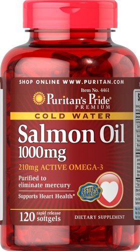 Puritans Pride Salmon Oil contains the finest Salmon Oil available. Take two softgels two times a day to gain the essential fatty acids your body needs for good health. Salmon contains a high concentration of Omega-3 fatty acids that have been shown to help promote metabolic, circulatory and heart health.