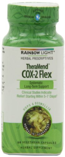 Rainbow Light Herbal Prescriptives TheraMend COX-2 Flex Systematic Long-Term Support - 50 Vegetarian Capsules TheraMend COX-2 Flex provides research-based, long-term support for chronic inflammation featuring a targeted blend that uniquely combines enzymes and standardized extracts of hops and boswellia, plus absorption-enhanced curcumin that aid in reducing pro-inflammatory markers found in the joints, skin, gastro-intestinal tract and throughout the body. TheraMend COX-2 Flex supports optimal range of motion and enhances your daily well-being. Clinical studies indicate relief starting within 5-7 days. Rainbow Light's Herbal IQ Guarantee means its products have been thoroughly reviewed by qualified herbalists and backed by the latest science. Extracts are identity verified and tested for purity, efficacy and safety. Formulated by Christopher Hobbs, PhD, and manufactured in the USA. Just two capsules per day support a healthy inflammatory response. Product Highlights: Promotes a healthy inflammatory response for systemic, long-term support and connective tissue restoration Highly concentrated herbal blend of hops, boswellia and absorption-enhanced curcumin Bromelain, a proteolytic enzyme aids in digesting excess fibrin Clinical studies indicate relief starting within 5-7 days Gluten-free, sugar-free, lactose-free, dairy-free and wheat-free Herbal IQ Guarantee ensures purity, efficacy and safety 100% Natural -- Free of artificial colors, flavors, sweeteners, preservatives and additives In two double blind placebo controlled clinical trials among people using 100 mg Apresflex (standardized from boswellia), individuals showed significant improvement in pain and stiffness within 5 to 7 days. Potent Herbal Extracts Suppport Healthy Inflammatory Response TheraMend COX-2 Flex delivers 500 mg hops extract (Perluxan) for fast-acting relief that inhibits the expression of COX-2 inflammatory pathways.