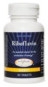 Riboflavin by Enzymatic Therapy Inc. 30 Tablet Riboflavin No. 16843 Dietary supplement essential for the production of energy Riboflavin works with two important enzymes (FMN and FAD) involved in energy production. Riboflavin is also required for antioxidant enzyme defense mechanisms. Riboflavin deficiency is generally characterized by cracking of the lips and corners of the mouth an inflamed tongue visual disturbances such as sensitivity to light and loss of visual acuity cataract formation burning and itching of the eyes lips mouth and tongue and other mucous-membrane disturbances. 30 tablets Amount per tablet Vitamin B2 (Riboflavin) 400 mg Other ingredients Stearic acid cellulose cellulose gum silicon dioxide and magnesium stearate. Recommendations One tablet daily. Contains no sugar yeast wheat gluten corn soy dairy products artificial coloring artificial flavoring or preservatives. Additional Information Quantity 30 Product Size Type Tablets ID Statement An essential vitamin for