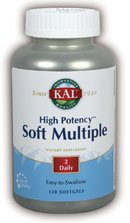 High Potency Soft Multiple by Kal 120 Softgel High Potency Soft Multiple Softgel dietary supplement. High Potency with Beta Carotene Easy to Swallow. High potency of all RDI ingredients listed except Biotin Calcium Iron Magnesium Selenium Copper Chromium Molybdenum. Size 120ct Softgel Directions As a dietary supplement take 1 or 2 softgels daily with a meal or a glass of water. Serving Size 2 Softgel 60 Servings per container Ingredients Amount per serving Daily Value + Boron (as Boron Glycinate) 1 mg Vanadium (as Vanadyl Sulfate) 10 mcg Inositol 50 mg Choline (as Choline Bitartrate) 50 mg Potassium (as Potassium Citrate) 30 mg 1 Selenium (as l-Selenomethionine) 25 mg 35 Molybdenum (as Molybdenum Amino Acid Chelate) 25 mcg 33 Magnesium (as Magnesium Oxide and Magnesium Citrate) 100 mg 25 Chromium (as Chromium Picolinate) 25 mcg 21 Calcium (as Calcium Carbonate and Calcium Citrate) 200 mg 20 Biotin 50 mcg 17 Vitamin B-12 (as Cobalamin Concentrate) 50 mcg 833 Iron (as Ferrous Fumarate)