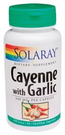 Cayenne With Garlic 540mg by Solaray 100 Capsule Cayenne and Garlic make a great combination. Both of these herbs contain potent active constituents. Size 100ct 540mg Directions As a dietary supplement take 1 or 2 capsules two times a day with meals or a glass of water. Serving Size 1 Capsule 100 Servings per container Ingredients Amount per serving Daily Value + Garlic (Allium sativum)(bulb) 270 mg Cayenne (Capsicum annuum)(pepper)(40000 heat unit) 270 mg Key to Ingredients Daily Value not established. + Percent Daily Value is based on a 2 000 calorie diet. Values differ depending on age Values differ depending on age Other Ingredients Gelatin (capsule) Other See product label for more information.