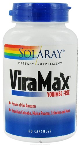 ViraMax Yohimbe Free by Solaray 60 Capsule ViraMax dietary supplement is an exciting new Performance Formula with Brazilian Catuaba. This combination of Catuaba Muira Puama Tribulus and Maca is sure to help support a healthy lifestyle. Size 60ct Directions As a dietary supplement take two capsules daily with a meal or a glass of water. Serving Size 2 Capsule 30 Servings per container Ingredients Amount per serving Daily Value + Peruvian Maca (Lepidium spp.)(root extract) (4 1) 100 mg Tribulus (Tribulus terrestris) (fruit) 250 mg Muira Puama (Liriosma ovata )(root) 400 mg Catuaba (Erythroxylum catuaba) (bark) 500 mg Total Carbohydrate 1 g 1 Key to Ingredients Daily Value not established. + Percent Daily Value is based on a 2 000 calorie diet. Values differ depending on age Values differ depending on age Other Ingredients Gelatin (capsule) Cellulose and Magnesium Stearate Other See product label for more information.