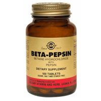 Solgar's beta-pepsin produces betaine hydrochloride, which aids in digestion by providing a favorable digestive environment. Digestive support. Sugar, starch and salt free. Gluten, wheat and dairy free.