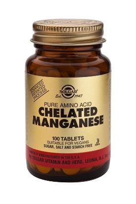Advanced Patented Process Suitable for Vegetarians Kosher Parve Essential Trace Mineral Suggested UseAs a dietary supplement for adults, one (1) tablet daily, preferably at mealtime, or as directed by a healthcare practitioner. Supplement Facts Serving Size: 1 Tablet Amount Per Tablet % Daily Value Calcium (as dicalcium phosphate) 50 mg 5% Manganese (as manganese glycinate amino acid chelate†) 8 mg 400% †Fully reacted chelates, Albion Amino process Patent No. 4,599,152 Chelazomes. Other IngredientsDicalcium Phosphate, Microcrystalline Cellulose, Vegetable Cellulose, Vegetable Magnesium Stearate. Solgar's Chelated Manganese Tablets are free of corn, yeast, wheat, soy and dairy products and are formulated without the use of preservatives, artificial flavors or colors. Sugar, Salt and Starch Free.