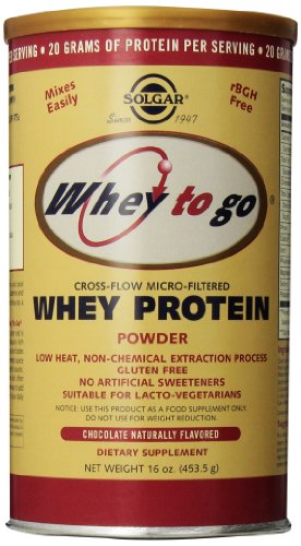 Solgar Whey To Go Natural Chocolate Cocoa Protein Powder has a new and improved formula, containing 20 grams of protein per serving. Solgar's Whey To Go Protein Powder is a highly efficient, scientifically advanced protein enhancement product.