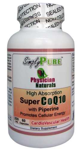 Physician Naturals Super CoQ10 200 mg now with Piperine for highest absorption. SimplyPure CoQ10 is a stabilized form of Ubiquinol an advanced Co-Enzyme which contains only the 100% natural, all-trans from of CoQ10 produced by fermentation. Each Coenzyme Q10 capsule contains 200mg of highest quality Ubiquinol in Trans-form for maximum absorption.