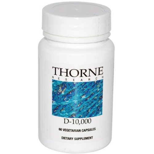 D-10,000For individuals needing high-dose vitamin D supplementationThorne's vitamin D is pure vitamin D - without hidden ingredients like lactose, BHT, BHA, sodium benzoate, and sorbic acid10,000 IUs per capsule for convenient, once-daily dosing in vitamin D-deficient individualsMade without flowing agents that can inhibit bioavailabilitySupports cardiovascular, immune, and bone health*It is essential to maintain healthy vitamin D levels throughout all stages of life, from fetal development to old age.* Vitamin D helps protect a number of important functions in the body.* The current recommended daily vitamin D intake ranges from 200-600 IU and is based on the minimum allowance to protect against bone disease. However, an upward revision of the FDA's guideline is now under consideration in light of new research, especially pertaining to immune function. Cutting-edge research suggests serum vitamin D levels should be in the range of 50-80 ng/mL 25-hydroxyvitamin D (25(OH)D). Although direct sunlight exposure is a good source of vitamin D, many people do not get enough sun due to season change, latitude, or lifestyle. Therefore, vitamin D supplementation can be of great benefit in these cases.*Vitamin D deficiency is quite common, particularly among the elderly.* For example, a study conducted at a hospital in Glasgow, Scotland, found an almost universal vitamin D deficiency among a group of 548 elderly patients. Individuals deficient in vitamin D may need 5,000-10,000 IU of vitamin D daily to replenish tissue stores.* Other individuals who may need higher doses of vitamin D include the obese (the more a person weighs, the greater their vitamin D requirements), individuals with chronic disease, darker-skinned populations, and those with fat malabsorption.* With these individuals specifically in mind, Thorne's D-10,000 supplies 10,000 IU of pure vitamin D3 in each vegetarian capsule.Some vitamins, because of their potency, are usually given in very small amounts. Examp