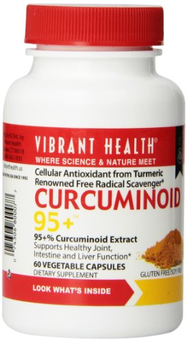 Curcuminoids are the brilliant orange pigments of Turmeric root (Curcuma longa). They belong to the family of polyphenols that includes all bioflavonoids, flavans and flavanols. All polyphenols are antioxidants, with certain groups stronger than others. Among the powerful are curcuminoids.Vibrant Health's Curcuminoid-95+ delivers 250 mg. of extract of Turmeric root in each Vegicap, 60 capsules per bottle. The extract is more than 95% curcuminoids (curcumin, demethoxycurcumin & bisdemethoxycurcumin), bio-active phenolic compounds renowned for free radical scavenging and antioxidant activity.Curcuminoids have historically and traditionally been used to protect against digestive disorders, liver disease and jaundice, urinary disorders, and skin problems, and to aid in wound healing, arthritic and allergic inflammations. In this last application, research demonstrates anti-inflammatory activity comparable to indomethacin and phenylbutazone.