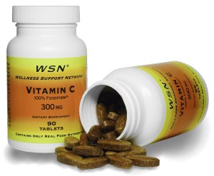 Vitamin C is an antioxidant. It is needed for tissue growth and repair, adrenal gland functions, healthy gums, skin and blood. It also aids in the production of anti-stress hormones, is needed for metabolism, protects against harmful effects of pollution, protects against infection, and enhances immunity. Without it you can bruise easily, have wounds that don't heal, gum problems and aching joints, etc. etc. Vitamin C - The Missing Vitamin Most of the supplements you find in health-food shops, drug stores and supermarkets contain vitamins that are really man-made chemicals and minerals that are just ground up rocks or mineral salts. Most of the vitamin C sold in the US is ascorbic acid. This is a man-made chemical found nowhere in nature. There is no ascorbic acid in an orange, tomato or broccoli, or any fresh fruit or vegetable. WSN® Vitamin C is 100% Foodform® 300 MG Contains Only Real Food Nutrients. There is a world of difference between Foodform® Vitamin C and ascorbic acid! Foodform® Vitamin C contains no ascorbic acid, and the body knows how to absorb and use it. Comparison studies showed that after 12 hours there remained 25 times more Foodform® Vitamin C in the blood stream than ascorbic acid. In fact, three Foodform® Vitamin C tablets contain almost as much vitamin C as a half-gallon of fresh squeezed orange juice! The problem for people who would like to supplement their vitamin C using orange juice is that orange juice contains more sugar than Coca-Cola!