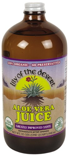 Aloe Vera Juice organic No preservatives by Lily Of The Desert 32 oz Liquid Aloe Vera Juice organic No preservatives 32 oz Liquid Product Enjoy all the 200 biologically active components of our Regular Aloe Vera Juices minus the preservatives. Our Preservative Free Aloe Vera Juice delivers essential amino acids vitamins minerals and enzymes. Lily of the Desert Preservative Free Aloe Vera Juice was the first on the market as a USDA certified organic aloe juice and it is now our 1 product Plus without preservatives you will enjoy a milder taste in these juices. Health Benefits Support healthy digestion Support a healthy immune system Reduce harmful toxins Increase absorption of nutrients Enhance antioxidant support Balance stomach acidity naturally Soothe occasional muscle and joint discomfort Suggested Use As a dietary supplement Upon opening refrigerate immediately. Take 2 ounces (4 Tbsp) per serving alone or mixed with a favorite juice. Up to 8 ounces daily. For those with more sever
